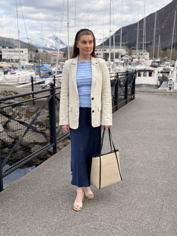 Veske og antrekk frå Kappahl, sko frå Skoringen.