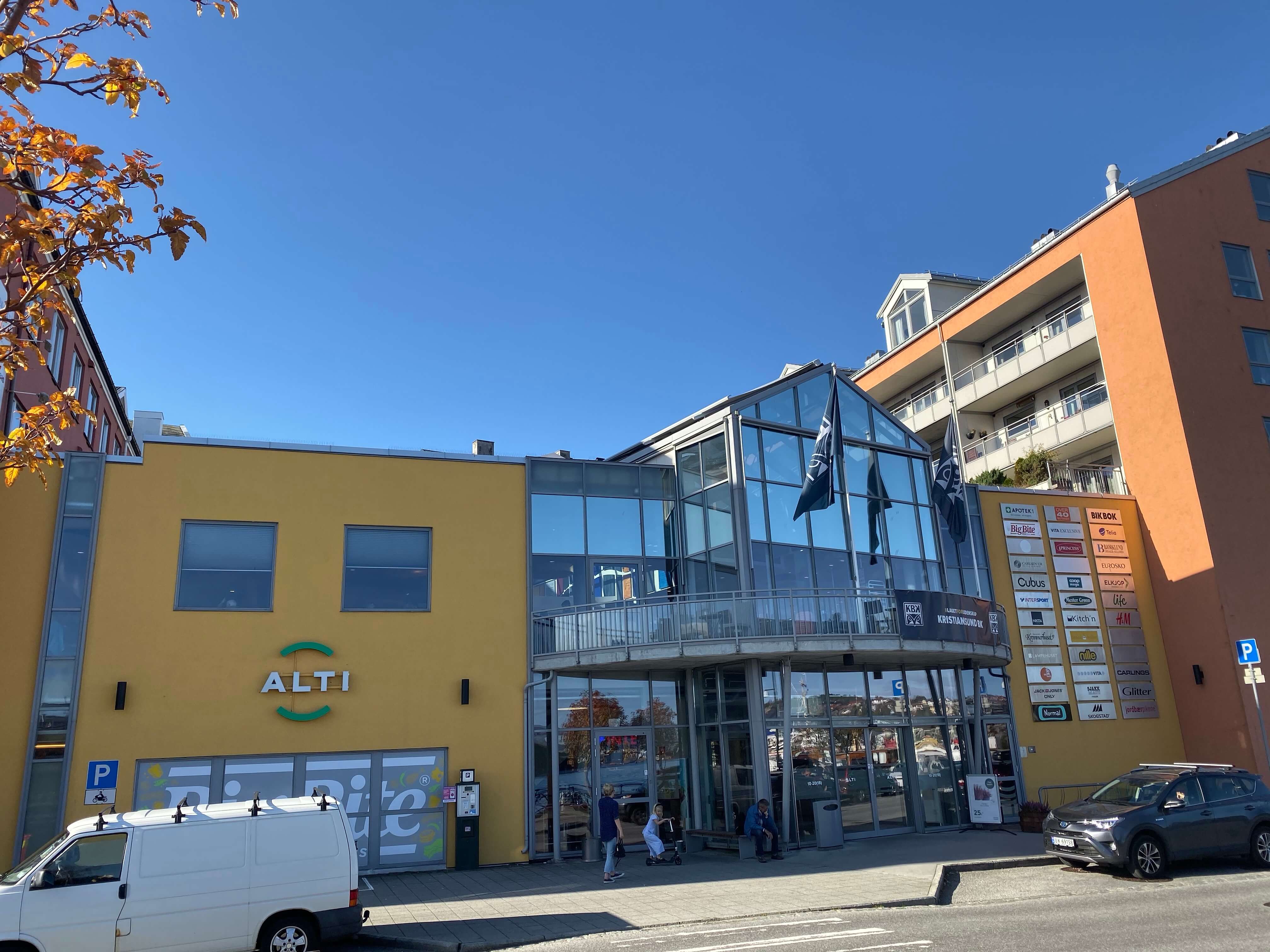 Bussen stopper like ved kjøpesenteret. Holdeplassen heter Rådhusplassen. Du går til høyre når du går av bussen og forbi Piren