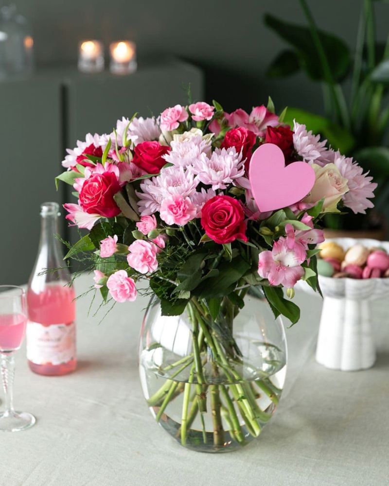 Bukett med ett rosa hjerte 375,-