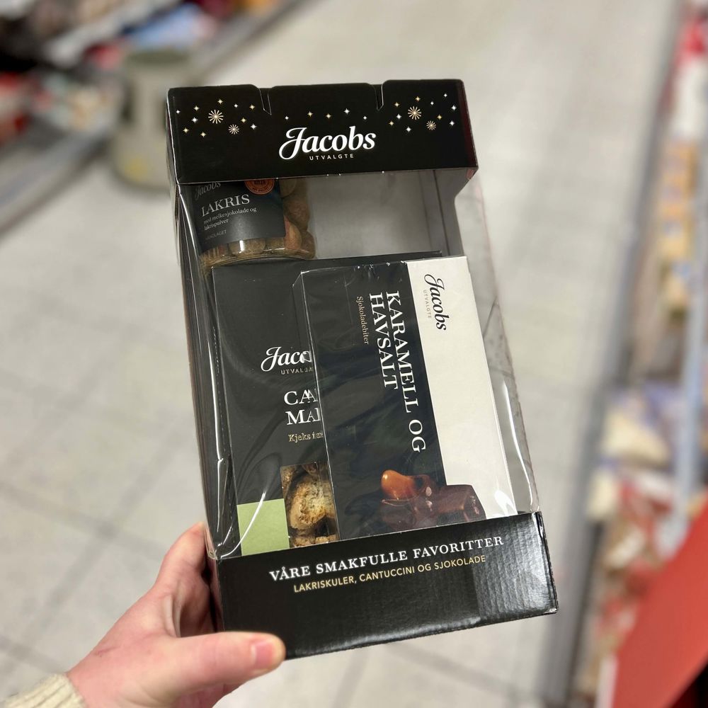 Jacobs gaveeske fylt med Lakriskuler, Cantuccini og sjokolade.
